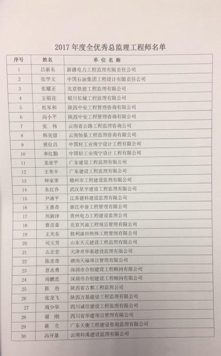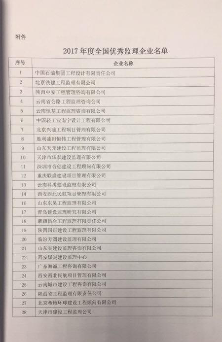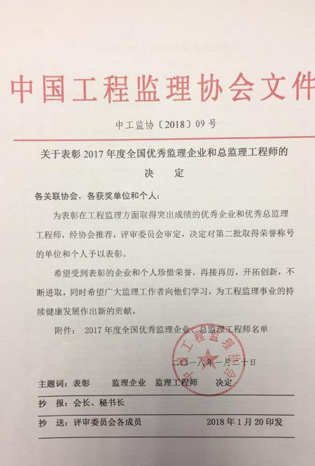 关于表彰2017年度全国优秀监理企业和总监理工程师的决定