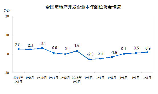 1-8月份,房地产开发企业到位资金79742亿元,同比增长0.9%,增速比1-7月份提高0.4个百分点。其中,国内贷款13956亿元,下降4.8%;利用外资204亿元,下降40.1%;自筹资金31797亿元,下降2.5%;其他资金33785亿元,增长7.5%。在其他资金中,定金及预收款19774亿元,增长4.6%;个人按揭贷款10118亿元,增长16.3%。