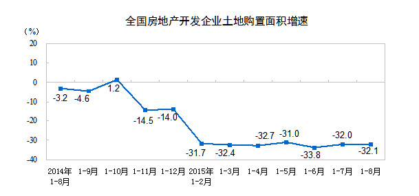 1-8月份,房地产开发企业土地购置面积14116万平方米,同比下降32.1%,降幅比1-7月份扩大0.1个百分点;土地成交价款4294亿元,下降24.6%,降幅收窄1个百分点。