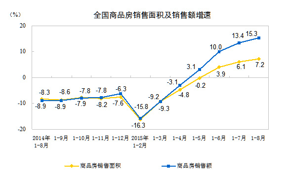 1-8月份,商品房销售面积69675万平方米,同比增长7.2%,增速比1-7月份提高1.1个百分点。其中,住宅销售面积增长8.0%,办公楼销售面积增长8.5%,商业营业用房销售面积增长1.2%。商品房销售额48042亿元,增长15.3%,增速提高1.9个百分点。其中,住宅销售额增长18.7%,办公楼销售额增长12.9%,商业营业用房销售额下降2.5%。