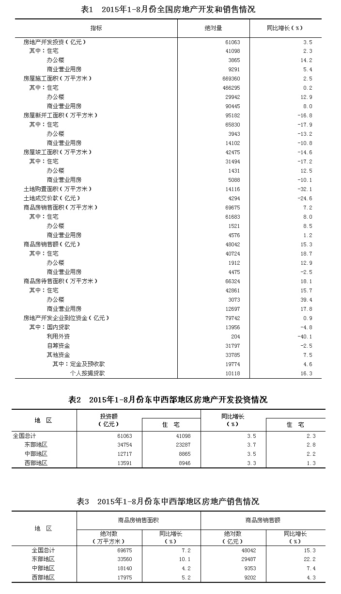 2015年1-8月份全国房地产开发投资和销售情况